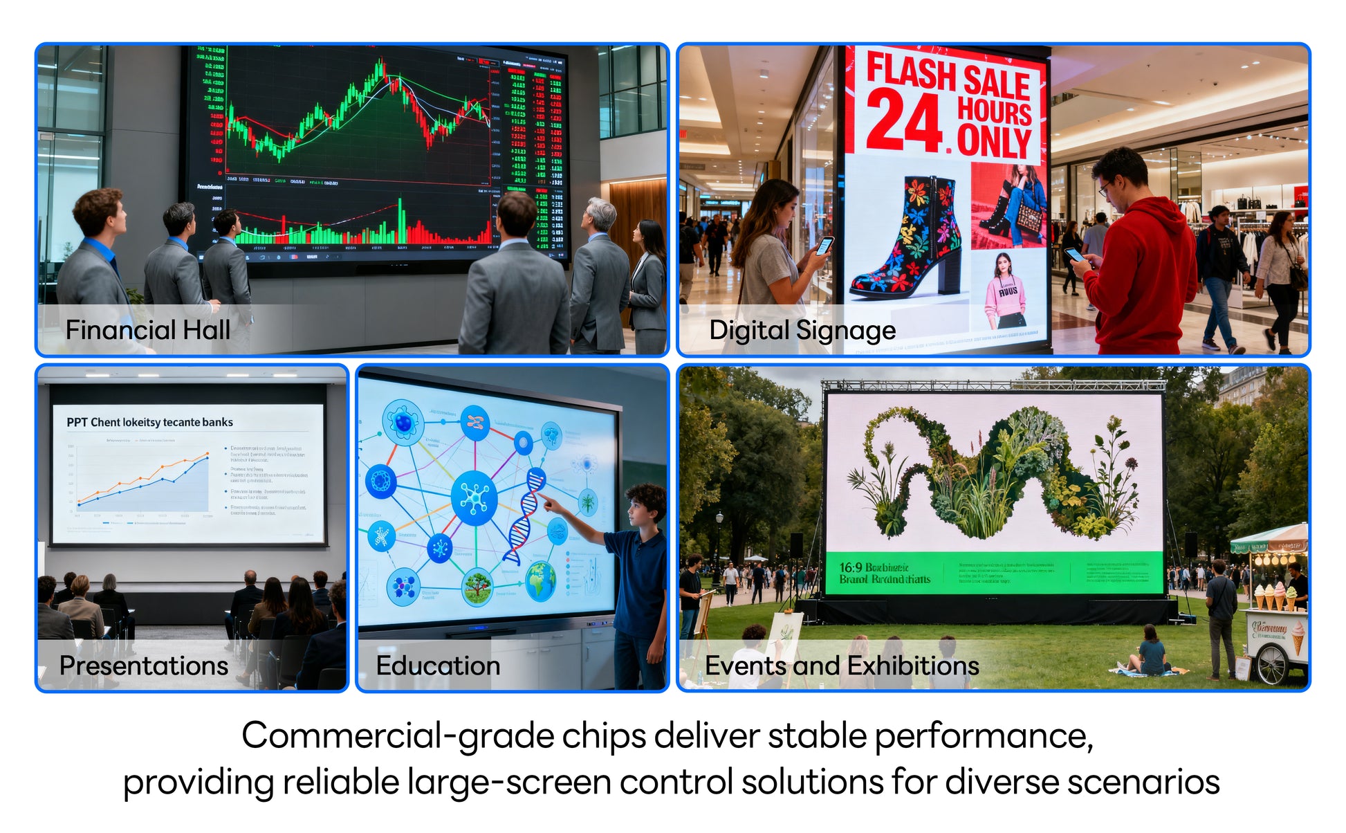 Designed for transmitting pristine 4K@60Hz signals, this 1x4 controller faithfully preserves image quality from HDMI 2.0 and DP 1.2 sources down to every screen. Whether displaying real‑time data, financial charts, or high‑definition advertisements, it eliminates compression and blur. Switch instantly among 8 professional layouts (e.g., 2x2, 1x4) with one click—making it the reliable core for mission‑critical video walls in trading floors, multi‑screen presentations, and digital signage. Multi‑unit cascading capability also enables easy expansion to higher‑resolution systems such as 8K