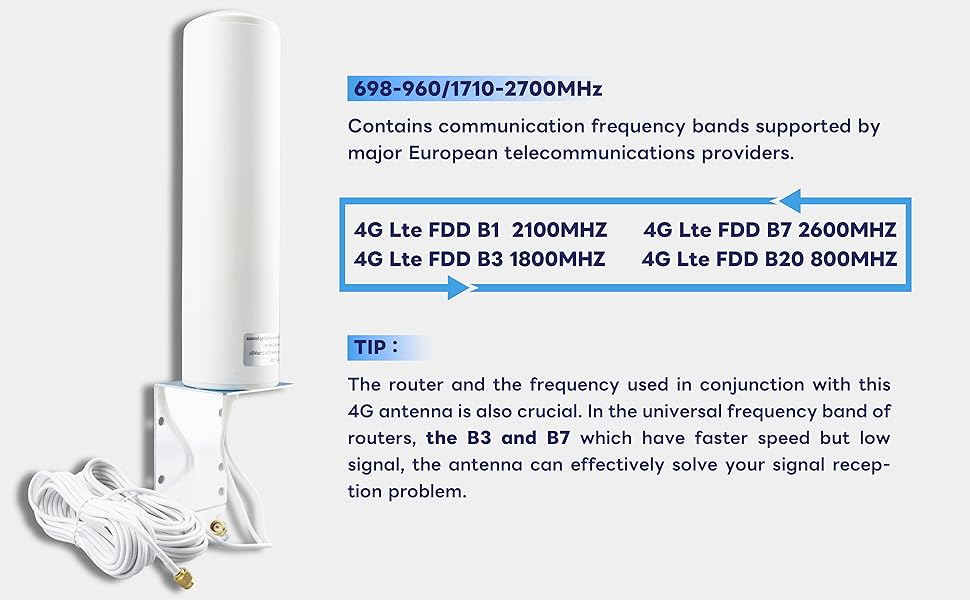 - ✔Performance:The 23cm Omni-directional antenna puts efforts in improving customer’s WiFi/4G experience by the range of 10dBi-12dBi. The frequency range is 698-960/1710-2700MHz to ensure the mobile or other devices can work in a weak signal area. The Voltage Standing Wave Ratio is less than to 2.0.