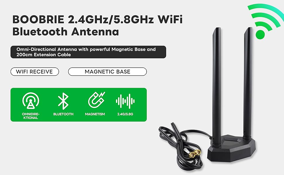 BOOBRIE Dual Band PC WiFi Antenna 5dBi External Wireless Antenna WiFi 2.4Ghz 5,8Ghz with 1.5M Cable RP SMA WiFi Router Signal Booster Magnetic Base Aerial for PC Desktop Computer PCI-E Wireless WiFi