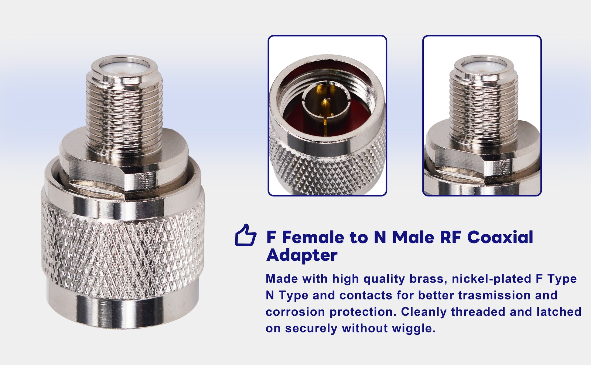 - 🧩Connector Type: N type Male (pin) to F type Female (no pin). One side is N Male Plug and the Other Side is F female Jack, connect F to N Device, used for Connecting F Male to N Female RF coaxial cable or device.